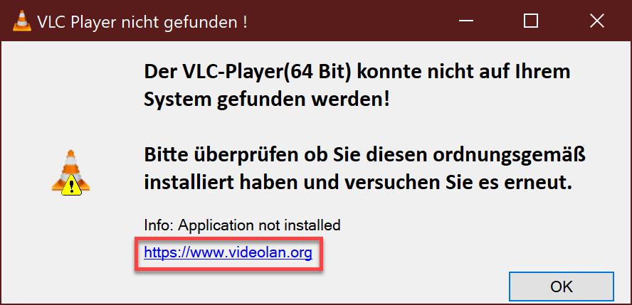 - Darstellen, Befahrungsvideo, VLC-Player: Ist der VLC-Player nicht installiert, wird im Informationsdialog ein Link zur VLC-Website bereitgestellt. Screenshot