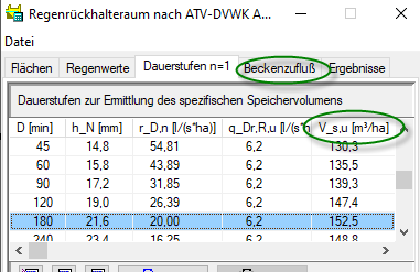 - Regenrückhalteräume: Berechnung des spez. Speichervolumens der Dauerstufen angepasst (richtige Berücksichtigung der Fülldauer des RÜB). Screenshot