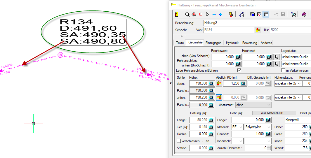 - Höhen am Schacht mit Höhe Haltungssohlen: Der berechnete Höhenblock wird jetzt bei mehreren Ausläufen so sortiert, dass der Auslauf mit der größten DN der erste ist (bisher Reihenfolge der Ausläufe zufällig). Screenshot