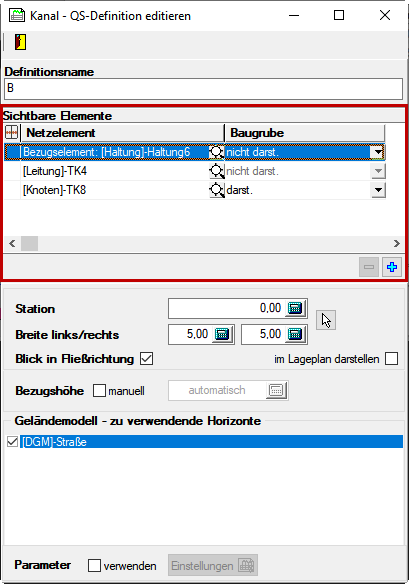 - Darstellen, Querschnitt - Zeichnen: Man kann nun in den QS-Definitionen unter "Sichtbare Elemente" Bauwerke und querende Leitungen/Haltungen wählen, die im Schnitt gezeichnet werden sollen. Screenshot