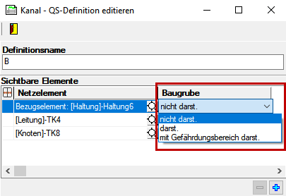 - Darstellen, Querschnitt - Zeichnen: Man kann nun in der QS-Definition einstellen, ob die Baugruben der sichtbaren Elemente gar nicht, ohne oder mit Gefährdungsbereich dargestellt werden soll. Screenshot