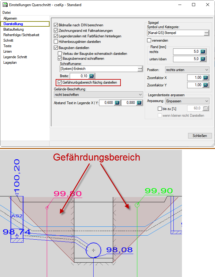 - Darstellen, Querschnitt - Zeichnen: Man kann nun in den QS-Einstellungen unter Darstellung bestimmen, ob der Gefährdungsbereich als Fläche dargestellt werden soll. Screenshot