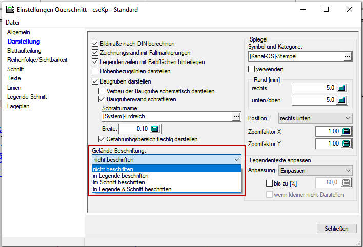 - Darstellen, Querschnitt - Zeichnen: Man kann nun in den QS-Einstellungen unter Darstellung bestimmen, wie das Gelände beschriftet werden soll. Screenshot