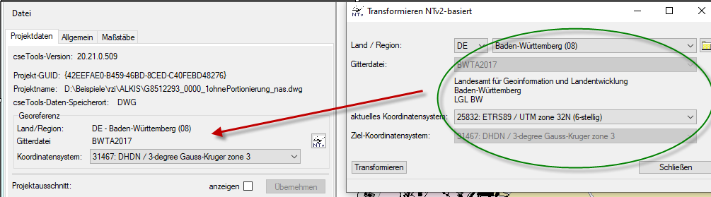 - Eine durchgeführte NTv2-Transformation setzt jetzt die Georeferenz im Projekt (bisher nur Koordinatensystem). Screenshot