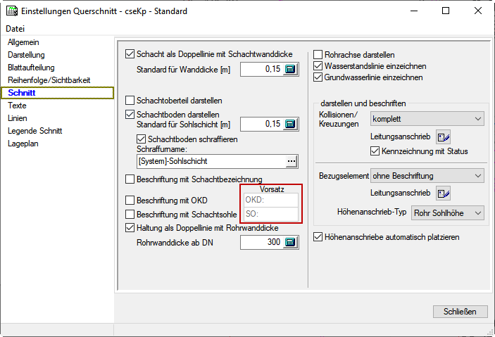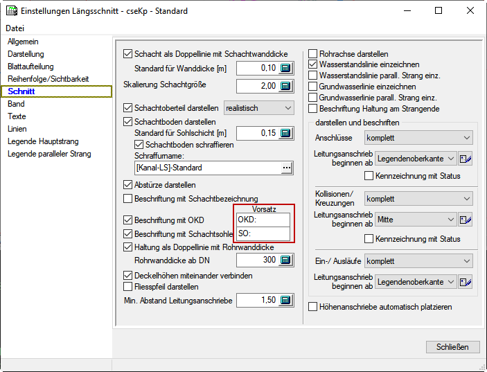 - Einstellungen, Querschnitt: Es ist nun möglich einen Vorsatz für die Beschriftung vom OKD und Schachtsohle zu bestimmen. Screenshot