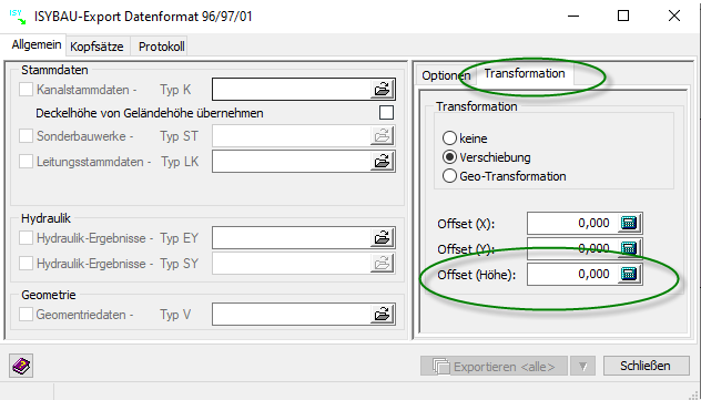 - Importieren/Exportieren ISYBAU/ISYBAU-XML: Die Transformation (Verschiebung) der Koordinaten ist jetzt auch mit Höhe möglich. Screenshot