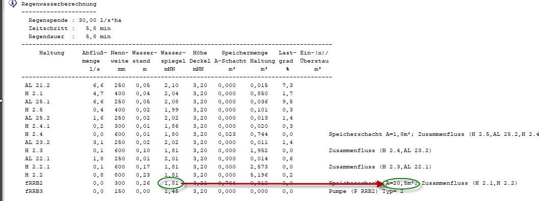 - Hydraulik, instationär: Im Protokoll der Berechnung erfolgt die Angabe der Fläche eines Speicherschachtes jetzt abhängig vom aktuellen Wasserstand (bisher immer Grundfläche). Screenshot