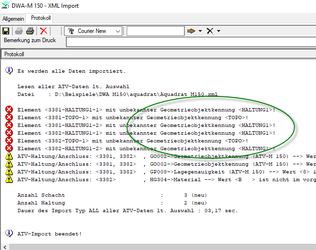 - Importieren, DWA-M 150: Die Geometrieobjektkennung wird jetzt explizit geprüft. Bisher wurden die Geometriedaten immer verarbeitet, auch wenn die Kennung ungültig/unbekannt ist. Screenshot