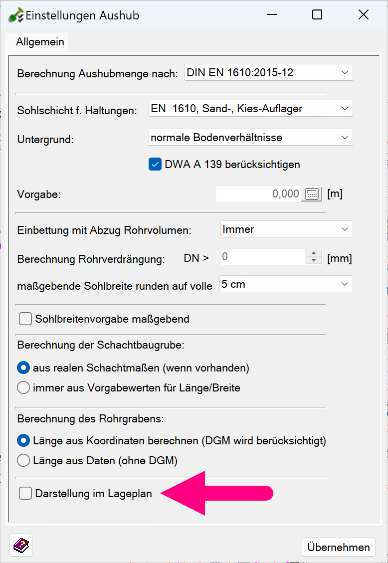 - Einstellungen, Aushub: Die Darstellung der Baugruben und Rohrgräben im Lageplan kann hier jetzt aktiviert werden. Screenshot
