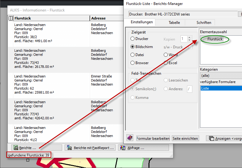 - Info Flurstück/Eigentümer: Beim Zeigen und Zoomen auf das gewählte Element wird dieses jetzt Hervorgehoben (im Beispiel gelb). Hervorhebung richtet sich nach der Einstellung HIGHLIGHTEFFECT des CAD. Screenshot