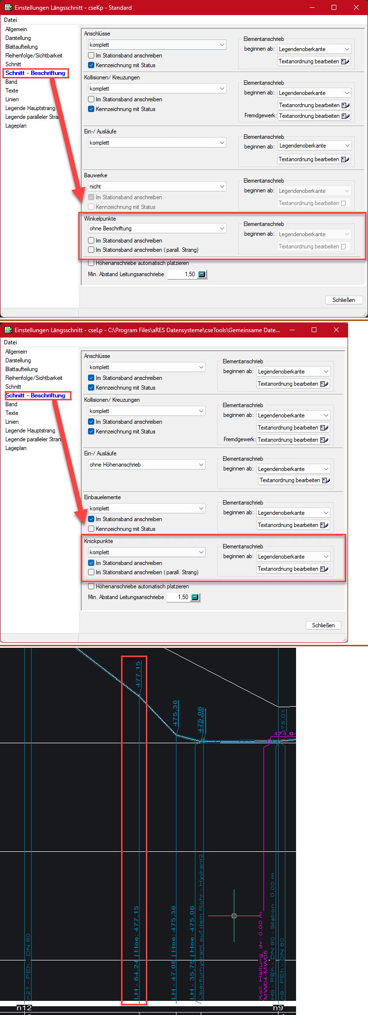 - Längsschnitt: Man kann nun für Winkel-/Knickpunkte ein Schnitt-Beschriftung einstellen. Screenshot