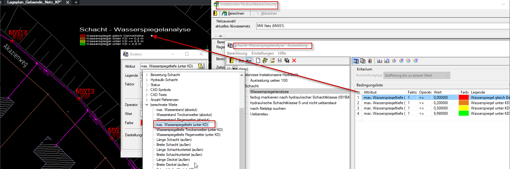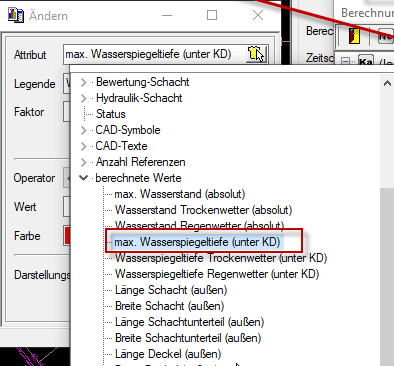 - Es werden neue berechnete Attribute am Schacht für eine Auswertung der Wasserspiegeltiefe (bezogen auf die Deckelhöhe) bereitgestellt. Screenshot