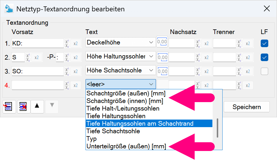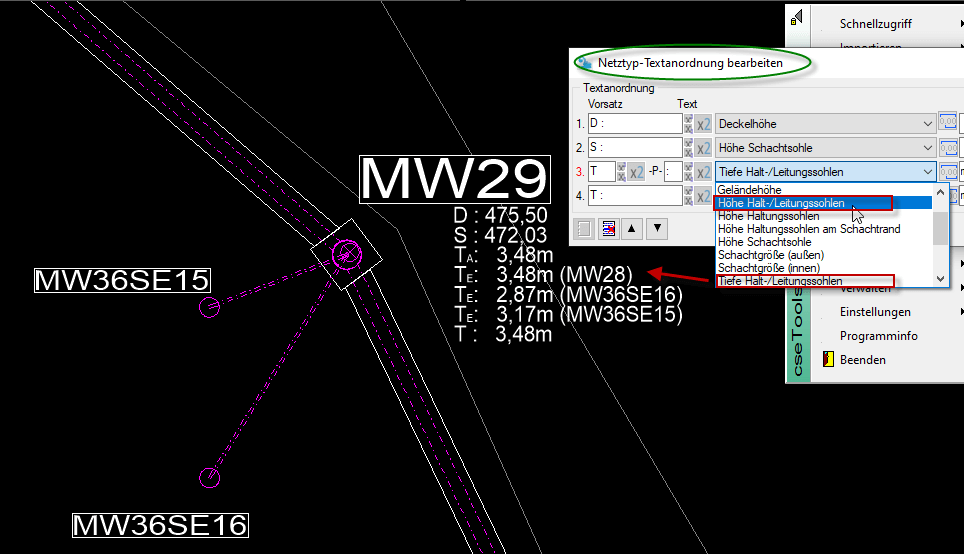 - Einstellungen, Netztyp, Schächte, Textwerte: Bei der Textanordnung können jetzt auch die Höhen bzw. Tiefen von Anschlüssen im Höhenblock mit ausgegeben werden. Screenshot