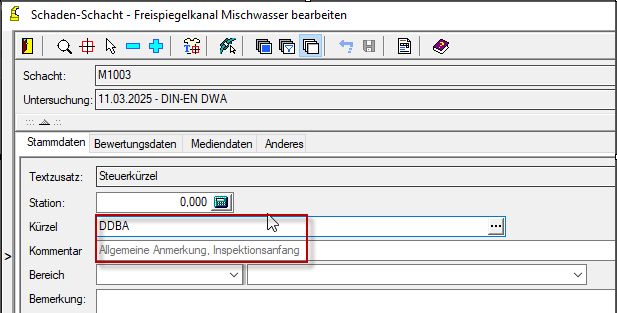 - Importieren, DWA-M 150: Es wird jetzt auch die Standardisierte Feststellung (SF) mit übernommen. Außerdem wurden die speziellen SF für Inspektionsanfang und Inspektionsende bei Schachtinspektionen richtig implementiert. Screenshot