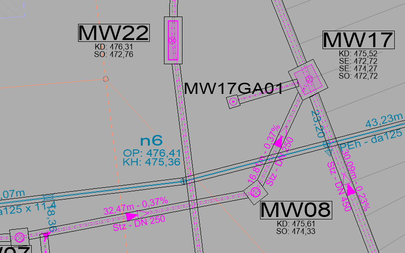 - Die Berechnung der Haltungslänge wurde für Sonderfälle angepasst. Dies betrifft z. B. die Berechnung, wenn Anfangs- oder Endschacht nicht da sind, aber Rohranschlusspunkte vorhanden, die Lage der Rohranschlusspunkte nicht auf der Achse Schachtmitte-Schachtmitte liegt.