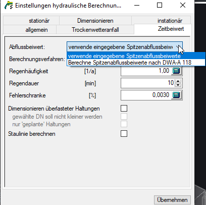 - Einstellungen, Hydraulik: Neuer Parameter 'Bildung des Abflussbeiwertes'. Damit können jetzt auch bei der Berechnung die Spitzenabflussbeiwerte automatisch nach DWA-A 118 ermittelt werden. Screenshot