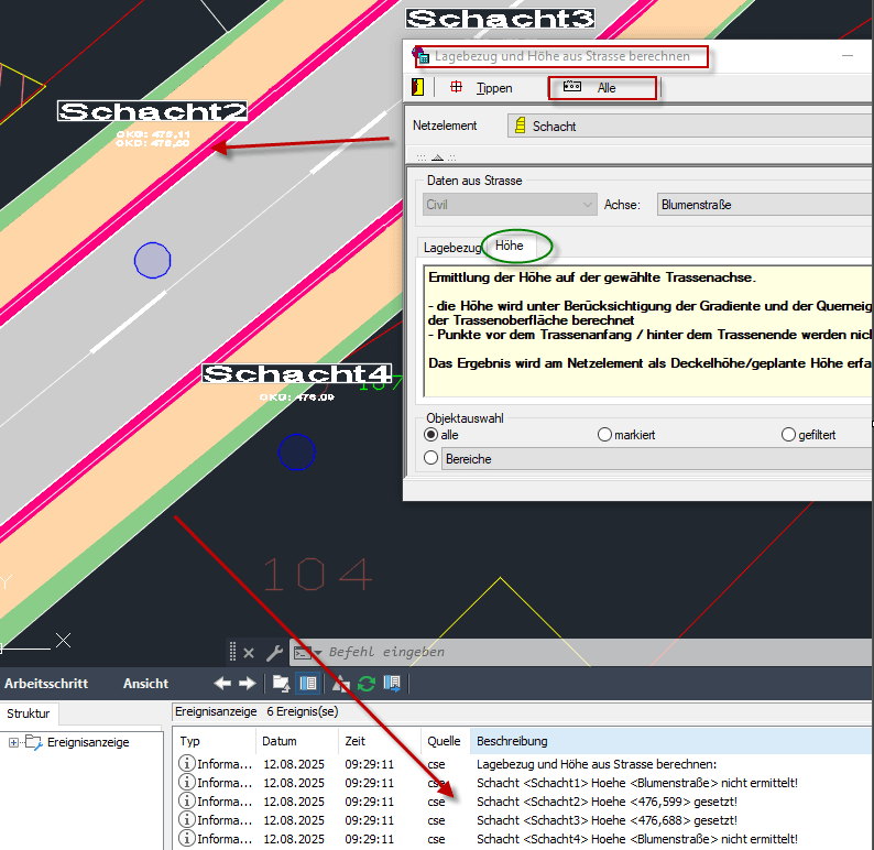 - Löscht man den Rohrgrabenpolygon mit dem CAD (cseschutz = <aus>), dann wird dieser beim neuen Zeichnen der Grafik nicht wieder erstellt und es kommt eine Fehlermeldung. -> korrigiert