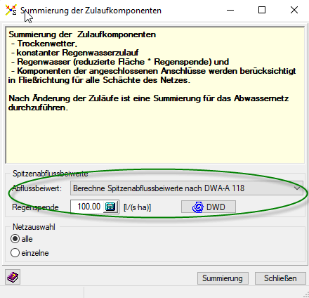 - Hydraulik, Zulaufsummierung: Hier ist es jetzt möglich eine automatische Berechnung der Spitzenabflussbeiwerte nach DWA-A 118 (an Bauzone, Einzugsgebiet, Haltung/AL) durchzuführen. Die berechneten Werte fließen dann in die Zulaufsummierung ein. Dies kann genutzt werden, um die automatische Berechnung der Spitzenabflussbeiwerte z. B. auch bei einer instationären Berechnung zu verwenden. Screenshot