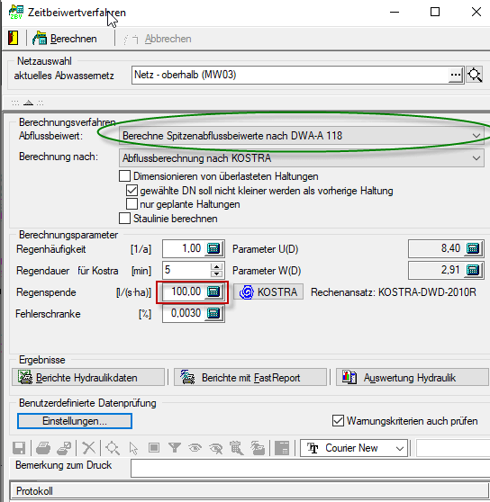 - Hydraulik, Zeitbeiwertberechnung: Es kann jetzt eine automatische Berechnung der Spitzenabflussbeiwerte nach DWA-A 118 unter Verwendung der gewählten Regenspende durchgeführt werden. Damit ist die vorherige aufwendige Eingabe der Spitzenabflussbeiwerte an den Netzelementen (Bauzone, Einzugsgebiet, Haltung/AL) nicht mehr erforderlich. Screenshot