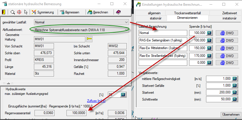 - Hydraulik, Bemessen Haltung: Es kann jetzt eine automatische Berechnung der Spitzenabflussbeiwerte nach DWA-A 118 unter Verwendung der gewählten Regenspende des Lastfalles durchgeführt werden. Damit ist die vorherige aufwendige Eingabe der Spitzenabflussbeiwerte an den Netzelementen (Bauzone, Einzugsgebiet, Haltung/AL) nicht mehr erforderlich. Screenshot