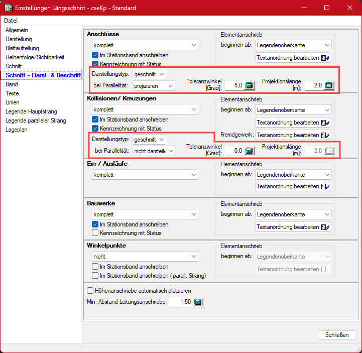 - Einstellungen, Längsschnitt, Schnitt Darst. & Beschriftung: Man kann nun die Darstellung von Anschlüssen und Kollisionen/ Kreuzungen einstellen. Dabei kann für den Fall der Parallelität zusätzliche Einstellungen gemacht werden. Screenshot