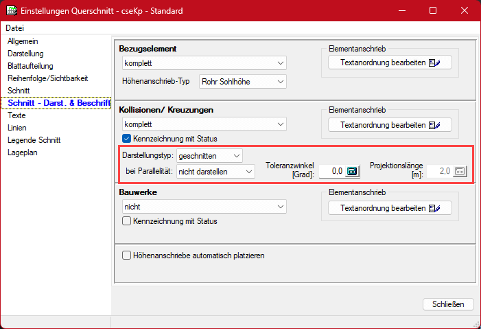 - Einstellungen, Querschnitt, Schnitt Darst. & Beschriftung: Man kann nun die Darstellung von Kollisionen/ Kreuzungen einstellen. Dabei kann für den Fall der Parallelität zusätzliche Einstellungen gemacht werden. Screenshot