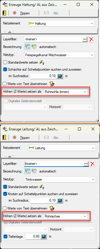 - Bearbeiten, Erzeugen, Leitung: Ist in den Standardwerten eine Nennweite vorgegeben, wird beim fangen von Blöcken mit Höhe diese als Rohroberkante übernommen.