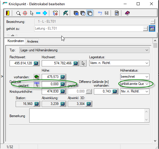 - Winkelpunkte/Knickpunkte haben jetzt auch eine geplante Geländehöhe. Screenshot