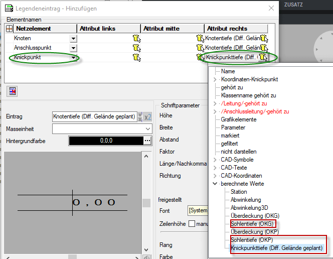 - Es werden jetzt weitere Attribute am Winkel-/Knickpunkt, bezogen auf das geplante Gelände (OKP) bereitgestellt. Diese können z. B. in der Legendenbeschriftung des Längsschnittes verwendet werden. Screenshot