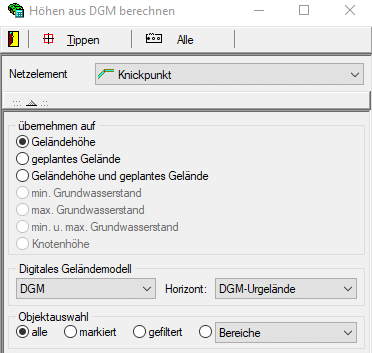 - Berechnen, Höhen aus DGM: Die geplante Geländehöhe kann jetzt auch an Knickpunkten berechnet werden. Screenshot