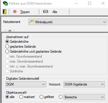 - Berechnen, Höhen aus DGM: Die geplante Geländehöhe kann jetzt auch an Winkelpunkten berechnet werden. Screenshot