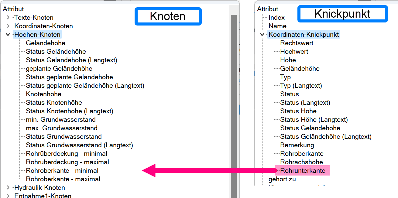 - Für Knoten ist jetzt auch das Attribut "Rohrunterkante" (vgl. Knickpunkte) verfügbar. Screenshot
