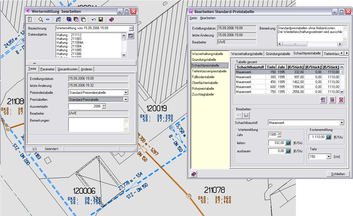 Es werden für einen ausgewählten Bereich eines vorhandenen Kanalnetzes Schächte und Haltungen, Wiederbeschaffungszeitwerte, Herstellwerte und Abschreibungsdaten mit Hilfe eines Mengenschätzverfahrens, auf der Grundlage der DWA-A133 berechnet.