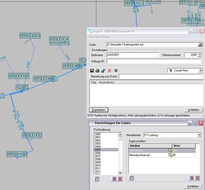 Dabei werden die Kodierungen des AKIA-Kataloges umgesetzt und Netzelemente eines Wasserversorgungsnetzes mit den entsprechenden Eigenschaften (DN, Material etc.) erzeugt bzw. übergeben.