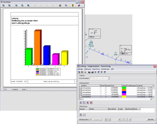 Konstruktionen, Auswertungen und Analysen werden leitungsspezifisch vorgenommen. Es wird gleichzeitig eine umfassende Dokumentation des Leitungssystems erstellt. Hierbei werden automatisch Berichte erzeugt oder die Daten in Diagrammform anschaulich aufbereitet.