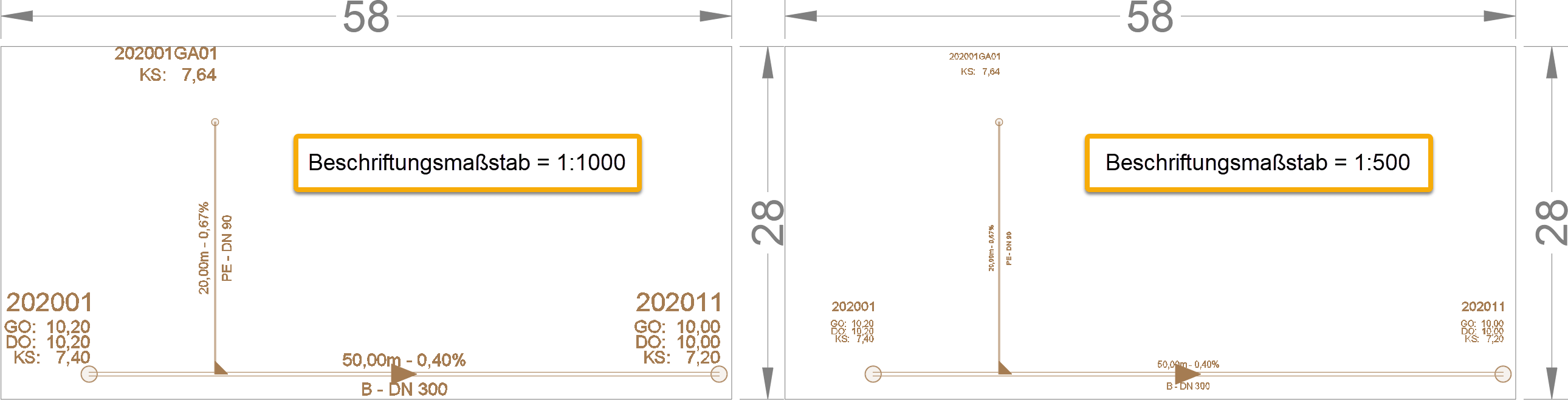 Beispiel: Der Beschriftungsmaßstab steht auf 1:1000 und in den Netztypeinstellungen ist vorgegeben, dass der Text 1 hoch ist.