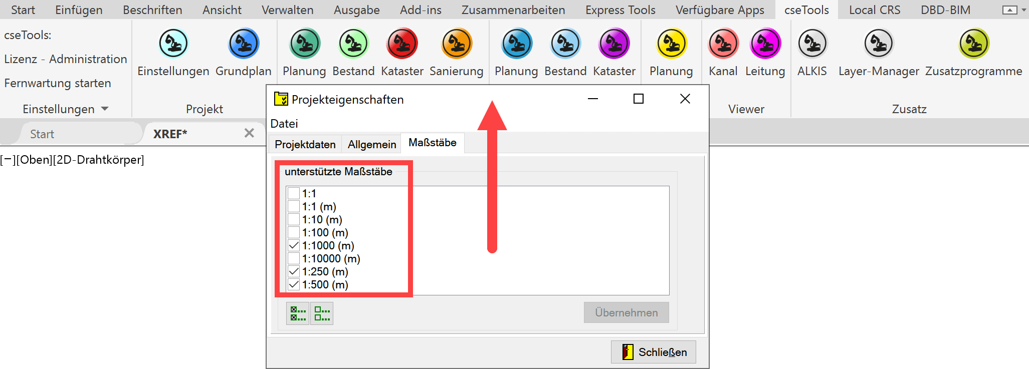 Um nicht jeden Text auswählen und die Objektmaßstabsliste ergänzen zu müssen gibt es in den cseTools Projekteinstellungen die Registerkarte Maßstäbe. Hier können jetzt alle Maßstäbe ausgewählt werden nach denen sich die Texte ausrichten sollen. Die Liste besteht aus den in der DWG-Datei enthaltenen Maßstäben.