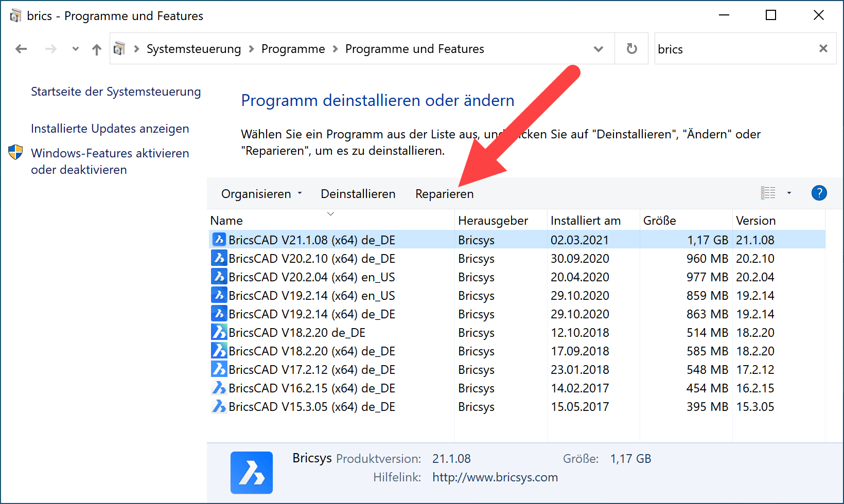 Dafür einfach Win+R drücken und im Ausführen-Dialog "appwiz.cpl" (ohne "") eingeben und mit Enter bestätigen. Im Fenster "Programme und Features" jetzt BricsCAD v21.1.08 suchen, anklicken und oberhalb der Liste auf "Reparieren" klicken.