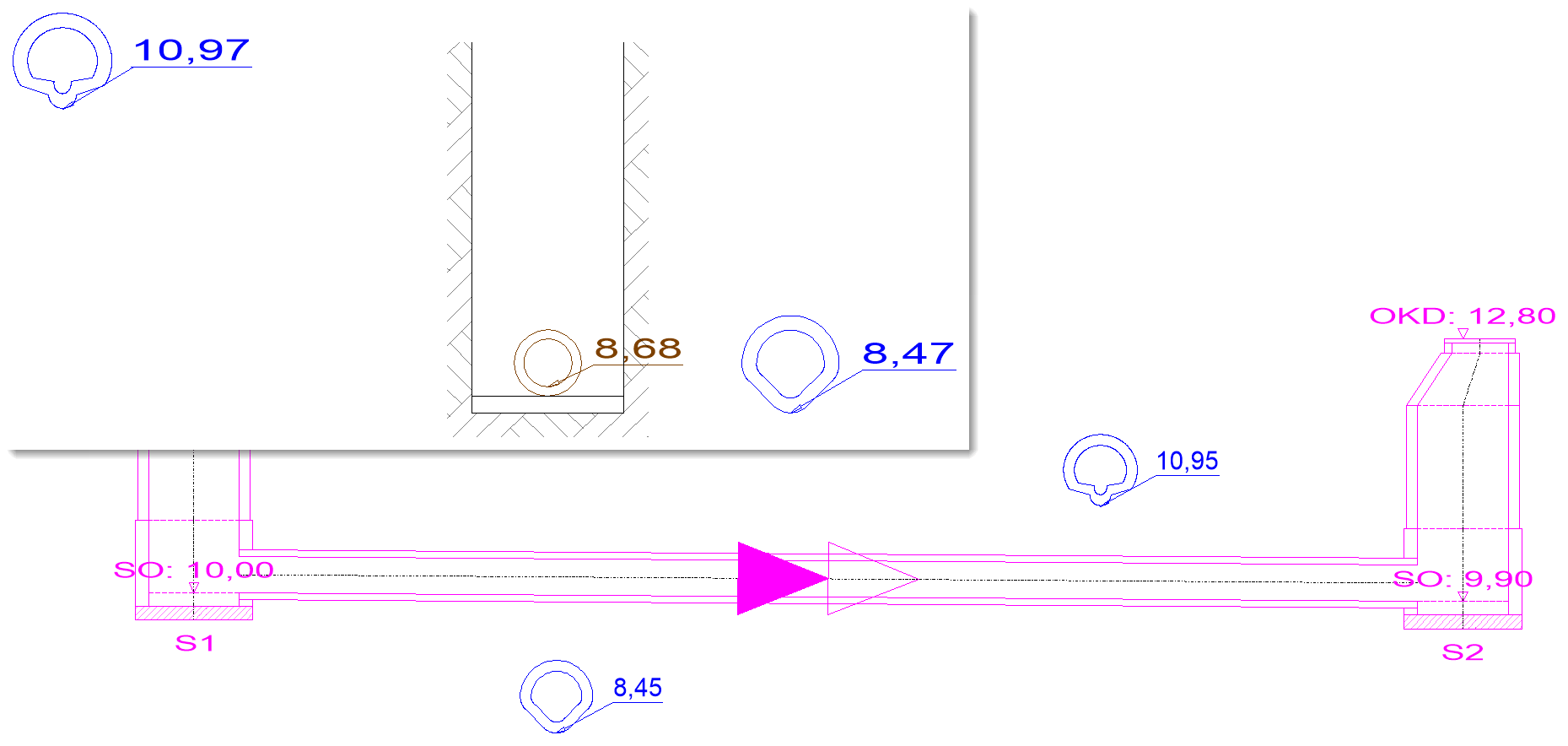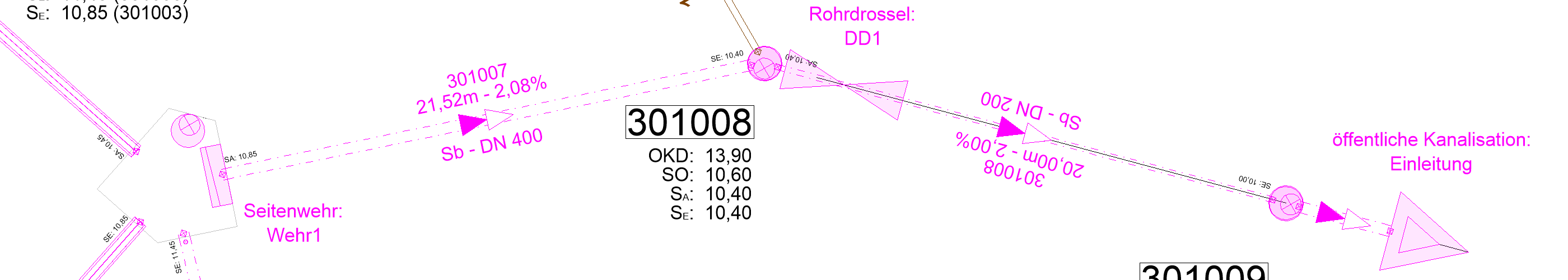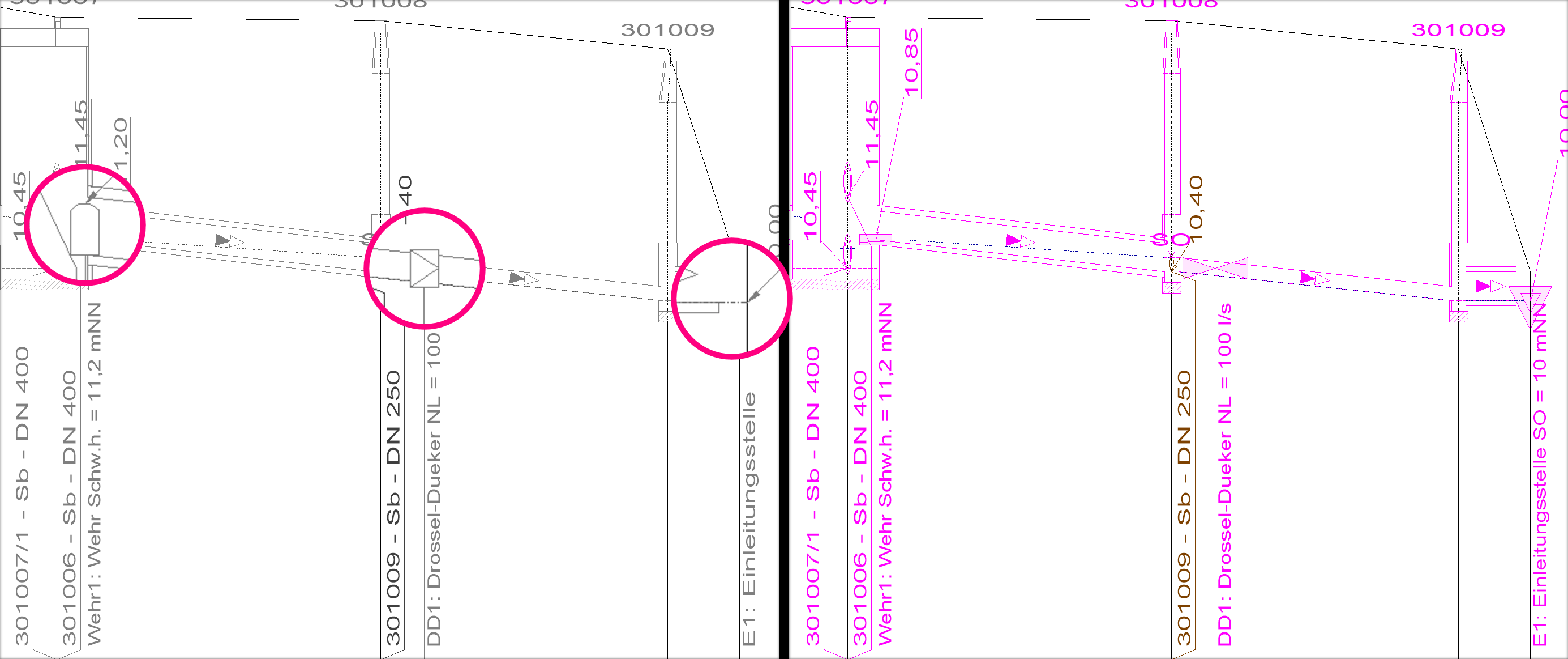 Bisher wurden hier einfach alte Symboliken oder keine Darstellung verwendet, was überhaupt nicht (mehr) der Darstellung auf dem Lageplan entspricht. In dem Bild oben sieht man den Vergleich zwischen alter Darstellung (links) und der Neuen (rechts). Hier sind die Sonderbauwerke einfach ohne nähere geometrische Beschreibung der Netztopologie hinzugefügt. Auf dem folgenden Bild sieht man den Strang zum Vergleich auf dem Lageplan.