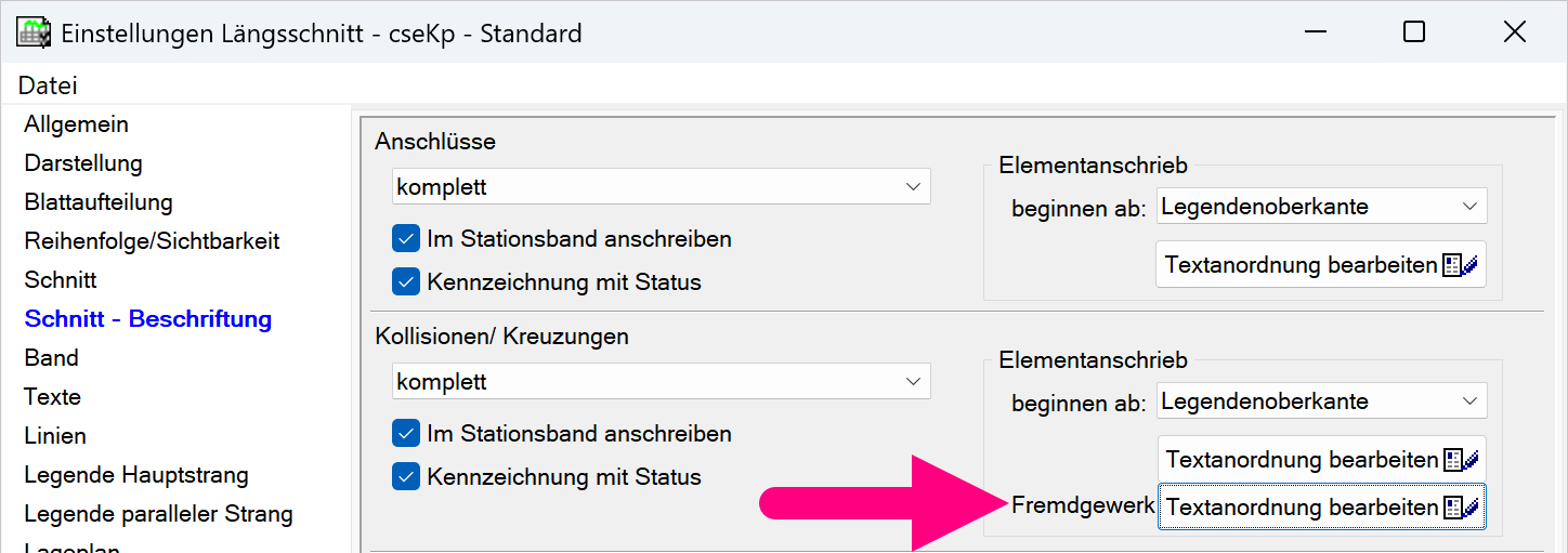 Bisher wurden Kollisionen und kreuzende Leitungen von Fremdgewerken genau so beschriftet, wie auch die Elemente des Hauptgewerks. Wenn ich also einen Kanal-Längsschnitt erzeuge, werden die kreuzenden Gasleitungen gleich beschriftet wie auch kreuzende / kollidierende Kanalelemente.
