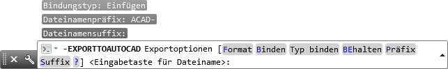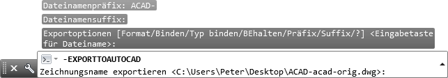 - In AutoCAD gibt es leider keinen so komfortablen Menüaufruf wie bei den folgenden beiden Systemen, dafür lässt sich das Exportieren aber mittels des Befehls „-EXPORTTOAUTOCAD“ (mit vorangestelltem Minus) durchführen