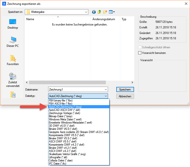 - Wählen Sie in dem sich öffnenden Fenster als Dateityp „AutoCAD DWG“ aus (ich empfehle, auch den haken „Pläne einbeziehen“ zu deaktivieren sofern nicht alle Layouts auch als separate DWG erstellt werden sollen)