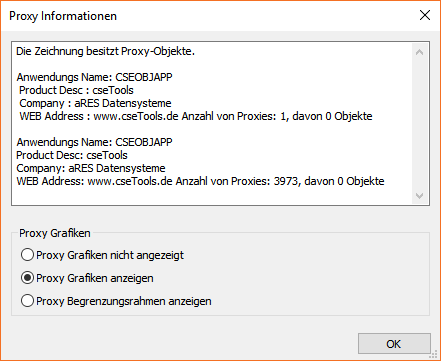 Sobald die cseTools geladen sind und eine Zeichnung geöffnet wird, werden sogenannte Proxyobjekte (Informationen zu Version, Projekteigenschaften etc.) in der DWG erzeugt.
