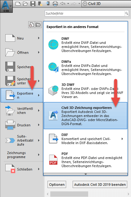 - Öffnen Sie das Civil 3D Startmenü und gehen dort auf Exportieren -> Civil 3D-Zeichnung exportieren