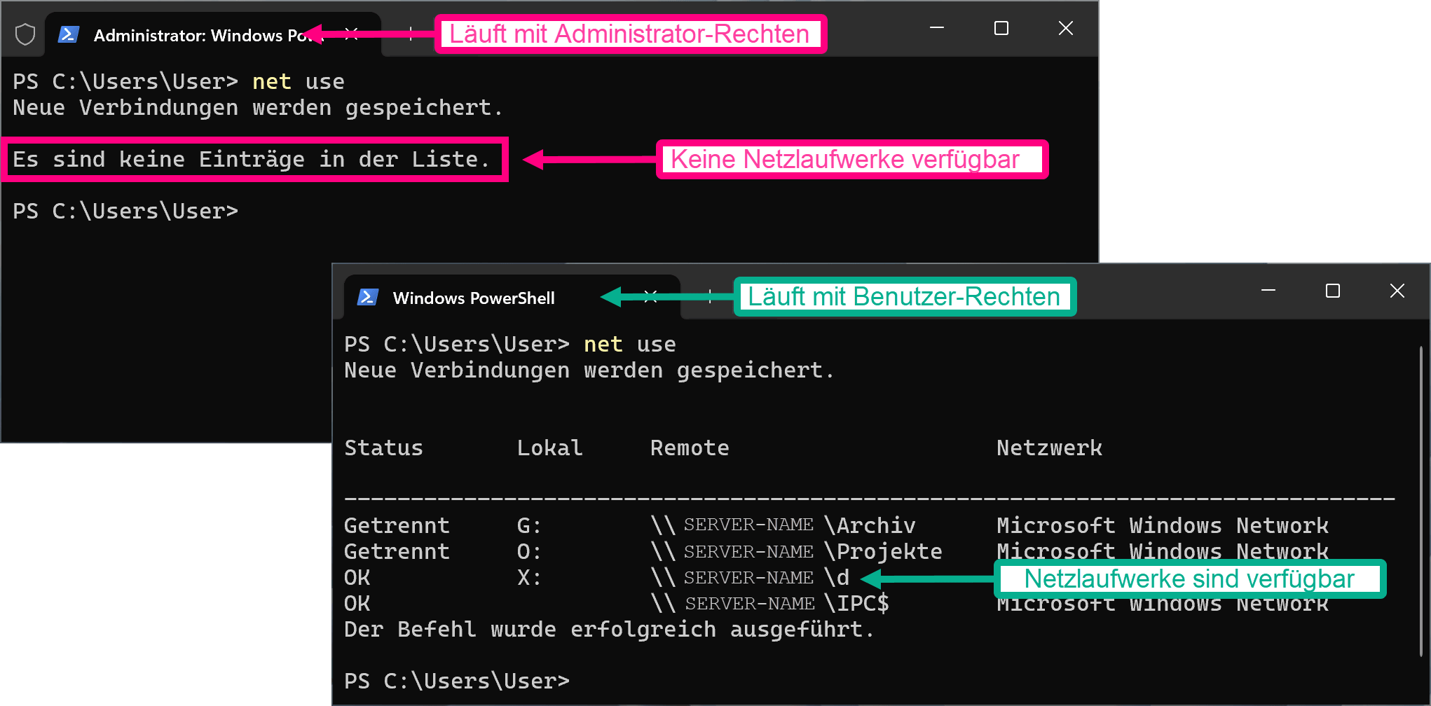 Netzlaufwerke sind meistens nur für den Benutzer eingerichtet, aber nicht für Anwendungen, die mit Administrator-Rechten laufen. Im folgenden Screenshot sieht man die Abfrage der verfügbaren Netzlaufwerke aus derselben Anwendung (Terminal). Einmal mit und einmal ohne Administratorrechte.